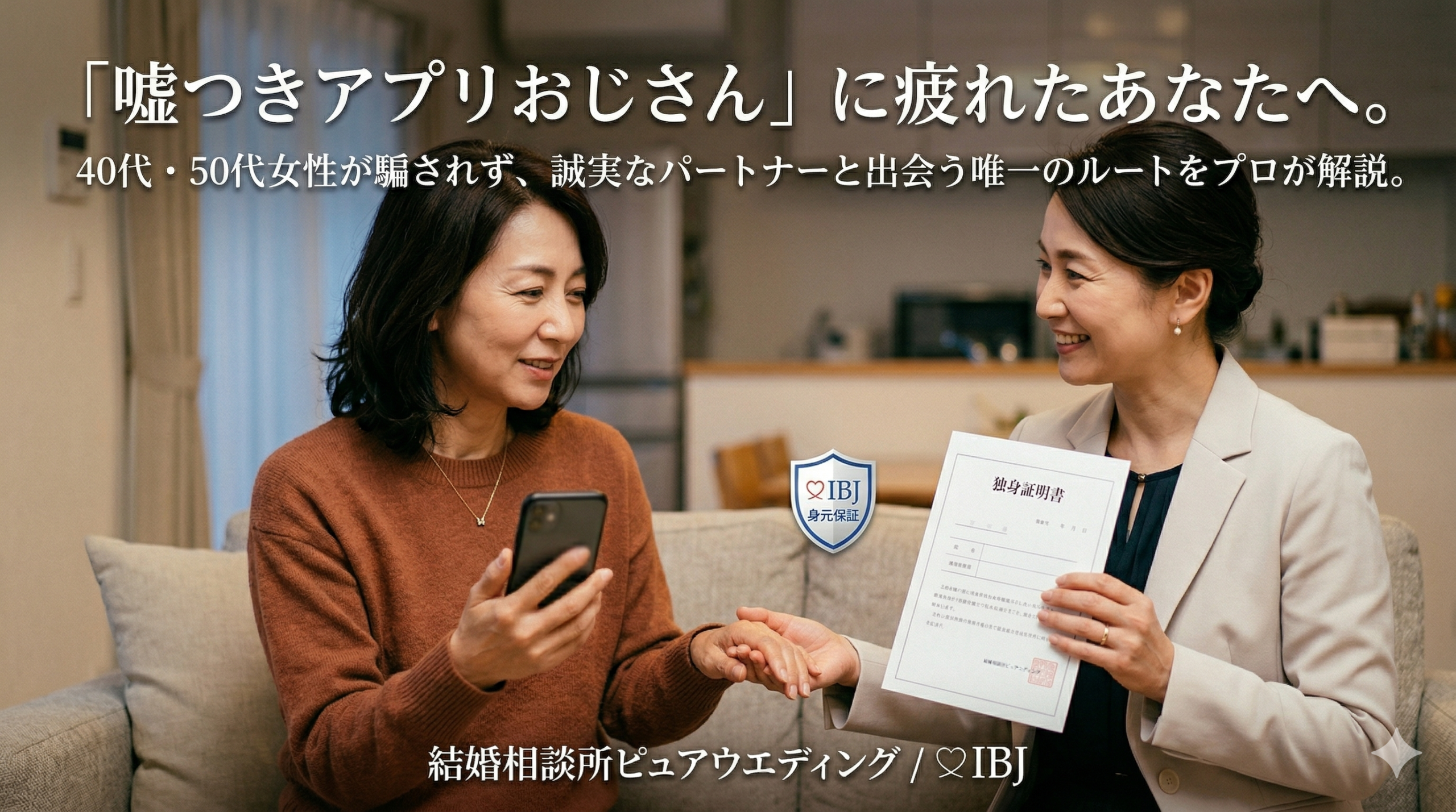 そう強く願うのであれば、アプリという「疑いながら戦う場所」から卒業するタイミングです。 大人の女性にこそ選んでいただきたいのが、身元が完全に保証された「結婚相談所」という選択肢です。